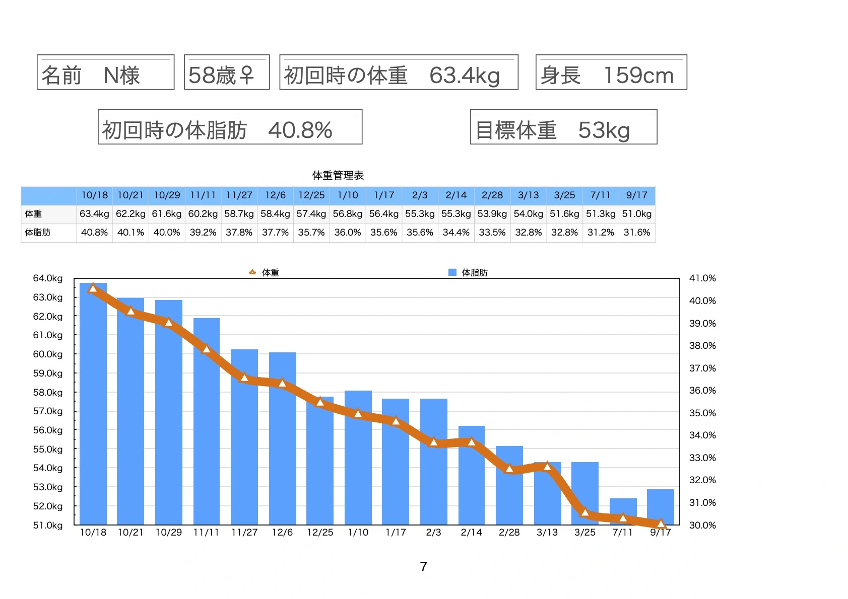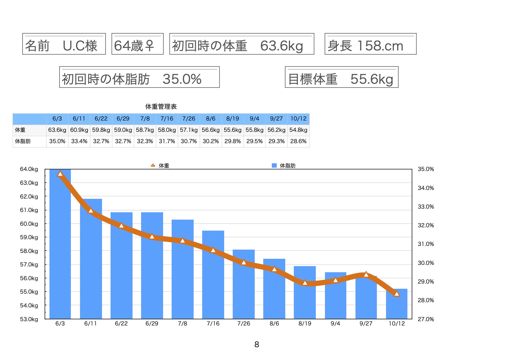 2ヶ月半で、➖8kg.体脂肪5.2%.40歳過ぎた頃から、だんだんと体重が増えてきて、洋服を買う時も身体のラインが出ないようなルーズな服を選ぶようになり、このままではまずいなと思いつつ、いつい運動はいやだし、食べるのも大好きだし、しょうがないと思っていました。